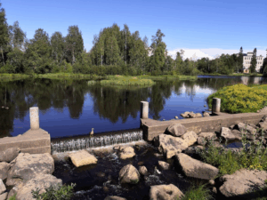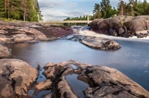 Oppaan kanssa ihaillaan Koitelin, Kiiminkijoen komeimman kosken, ja sen saarien kauniita maisemia.